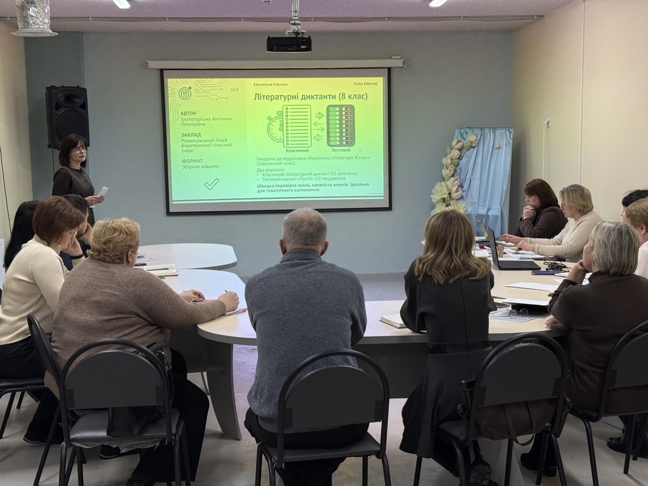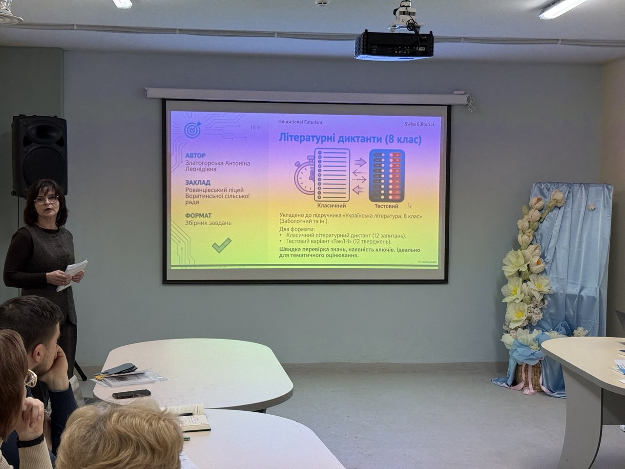 Антоніна Златогорська подала розробку збірник «Літературні диктанти (8 клас)», укладений відповідно до чинного підручника з української літератури для 8 класу (автори — Віктор Заболотний, Олександр Заболотний, Ольга Слоньовська, Іванна Ярмульська). Матеріали спрямовані на перевірку знань, закріплення теоретичних понять і розвиток навичок уважного читання.
